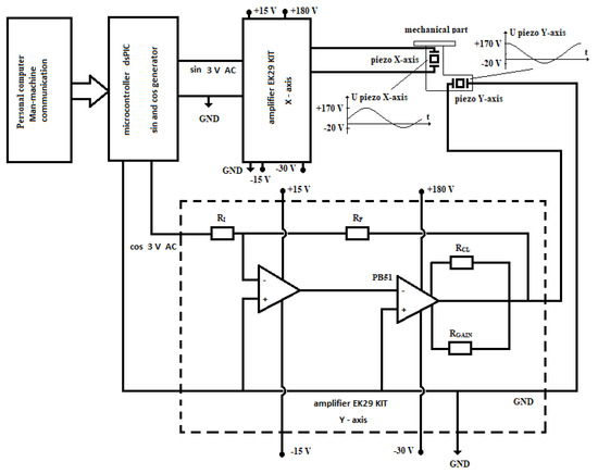 The electronic part of the laboratory set-up is presented in Figure 2. A personal computer was used as the man-machine communication and was connected via USB to a UART cable to a dsPIC microcontroller. The dsPIC microcontroller calculated two AC output signals (0 V to 3 V) for the X axis and Y axis piezo actuators with changeable frequency (1 Hz to 10 kHz), the changeable phase between the X-axis and Y-axis output voltages (−180° to + 180°) and changeable amplitudes of both voltages (-20 V to +170 V). The generated sine (for the X-axis) and cosine (for the Y-axis) signals were amplified with two EK29 KITs amplifiers to maximal amplitudes +170 V and −20 V and maximal effective current Ieff, max = 1.5 A. The amplified voltage for both axes were used to supply both piezo actuators in the mechanical part of the laboratory set-up (see Figure 1). The core of the EK29 KIT amplifier is a high voltage operational PB51amplifier produced by APEX Microtechnology (Tucson, Arizona, USA).