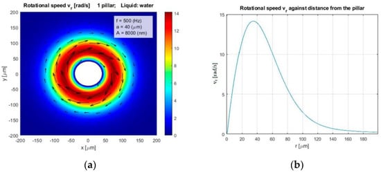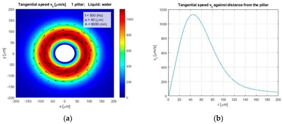 The calculated rotational speed [rad/s] of the rotated water stream around the circular vibrated pillar against the distance from the pillar r are shown in Figure 3a, and its amplitude in Figure 3b. The simulated tangential speed and its amplitude around the same pillar are presented in Figure 4a,b, respectively. The liquid was water with kinematic viscosity 1.0 × 10−6 m2 s−1, the radius of the pillar was a = 40 µm, the amplitude and frequency of the circular vibration were A = 8 µm and f = 500 Hz, respectively. Equations (1)–(11) showed that the rotational and tangential velocities can be increased by increased amplitude A, frequency f, and decreased fluid’s kinematic viscosity .