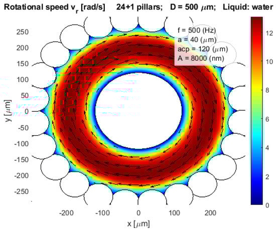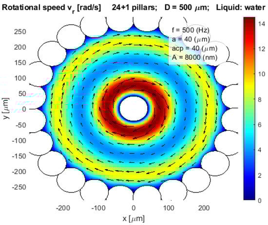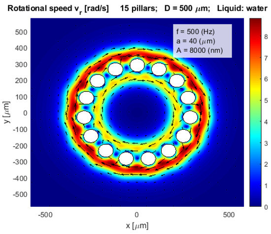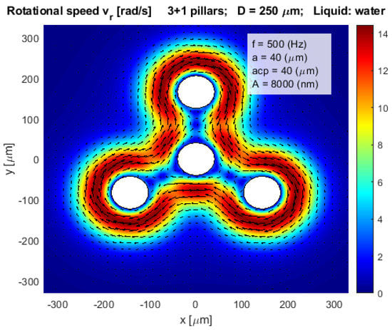 Figure 8 presented the same configuration of pillars as the previous Figure 7 with one exception, a central pillar with a radius acp = 40 µm was added in the middle of the pot. Here the average rotational speed of the water stream was increased dramatically in comparison with the previous Figure 7. The highest rotational velocity was approximately 14 rad/s about 50 µm away from the central pillar, the lowest rotational velocity was approximately 5 rad/s about 150 µm away from the central pillar, and the rotational velocity nearby the pot wall was again increased to 9 rad/s.