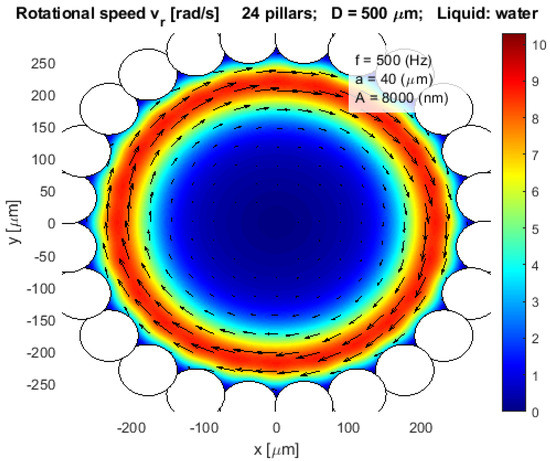 Figure 7 presented the simulation results of the model of completely closed configurations of pillars, where 24 pillars even overlap each other. The maximal rotational velocity was approximately 9 rad/s at a distance 50 µm away from the pot wall, and then the rotational velocity was decreased exponentially to zero in the middle of the pot. The inner diameter of the pot was D = 500 µm, and the amplitude and the frequency of the circular vibration were A = 8 µm and f = 500 Hz, respectively.