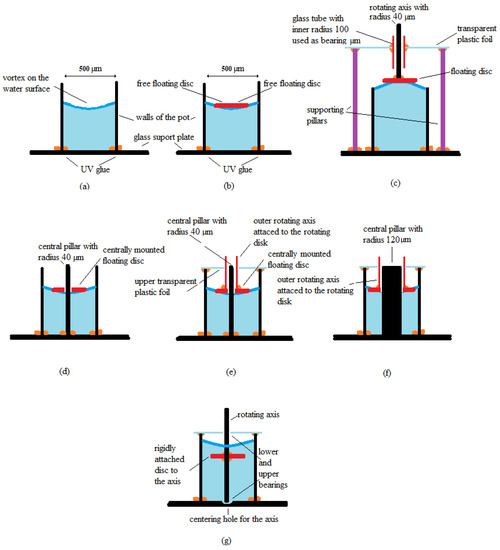 Seven tested types of pot-like microfluidic rotational vibrational motors with: (a) Vibrational pot-like mechanism. (b) Free floating rotating disc. (c) Pot-like microfluidic rotational vibrational motor with concave shape of the water surface. (d) Centrally mounted floating disc on the central pillar with radius 40 µm. (e) Centrally mounted floating disc on the central pillar with radius 40 µm and attached outer rotating axis. (f) Centrally mounted floating disc on the central pillar with radius 120 µm and attached outer rotating axis. (g) Disc attached rigidly to the rotating axis.
