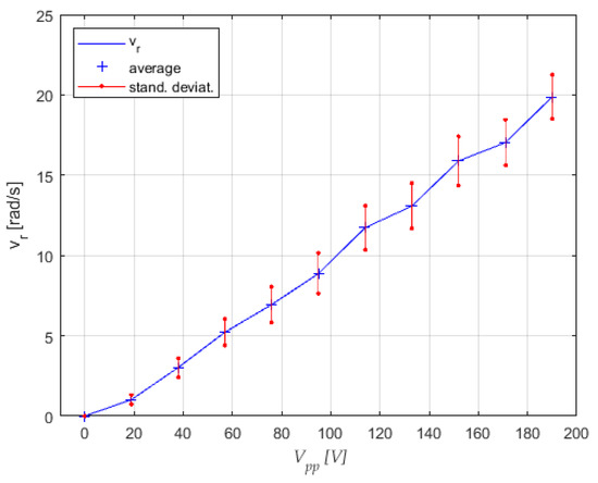 It was also observed that the streaming of the water around the center was also a bit elliptical. The regular circle was, in fact, very rare. But the results of this experiment were very promising for the next performed experiments. The maximal rotational speeds in both directions were between −19 rad/s and +20 rad/s, measured at frequency f = 400 Hz, and the amplitudes of both actuators and at 8 µm and 10 µm, respectively. The rotational speed vr was variable and well controlled, with almost linear dependency between the voltage amplitude of the sine and cosine signals to the piezo actuators Vpp and rotational speed of the streaming water vr (see Figure 12). The average values and Standard Deviation for every measurement point in Figure 12 were calculated from ten measurements. The linear dependency between the rotational speed of the water streaming in the pot and applied sine and cosine voltage Vpp to piezo actuators allowed us simple control of the pot-like vibrational micromotor.