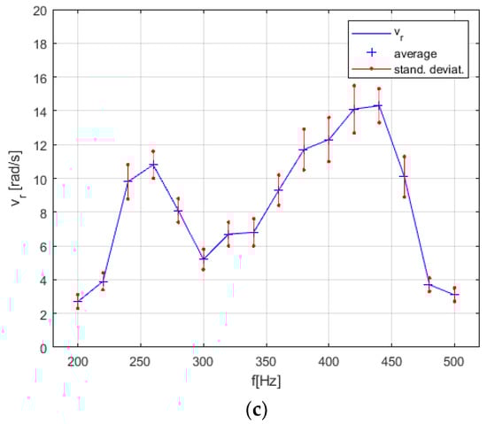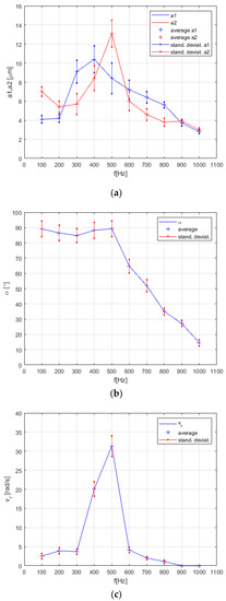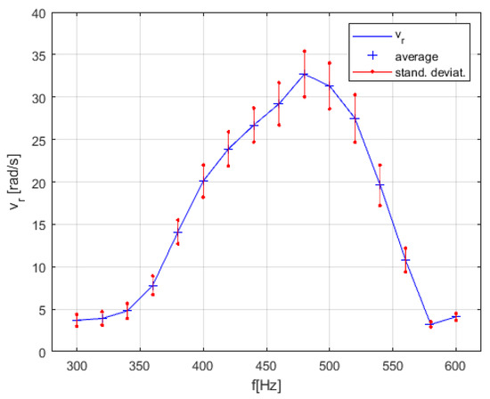 We observed that the rotational speed of the water inside the pot was heavily dependent on the vibrations’ frequency in the real lab experiment, which was not predicted by the mathematical model described by Equations (1)–(12). The streaming of water at some frequencies stopped completely. Sometimes we also had two, or even more, small rotating whirls in the pot, especially at higher frequencies between 650 Hz and 1000 Hz. Therefore, we measured the amplitudes and , phase shift angle α between both directions of amplitudes and rotational speed as a function of the applied vibration frequency f. The measured data are presented in Figure 13. The average values and Standard Deviation for every measurement point in Figure 13a–c) were calculated from ten measurements. The resonant peak of rotational speed of the whirling water in the pot between frequencies 300 Hz to 600 Hz (see Figure 13c) was measured once again, but every 20 Hz, again with 10 measurements at every measurement point. The average calculated rotational speeds and their Standard Deviation at every measurement point (every 20 Hz) are presented in Figure 14.