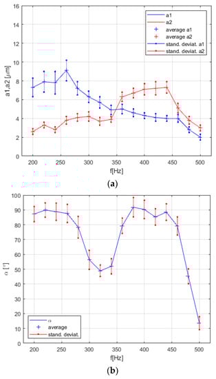 Of course, the rotational speed and maximal torque should be increased by working with a better electronic amplifier. Our amplifier (presented in Section 2.2) had the cut off frequency approximately at 500 Hz, so higher frequencies did not produce enough vibration amplitudes and a2. A better electronic amplifier would also prevent the shift angle α from being remarkably reduced at a higher frequency than 500 Hz (see Figure 13, Figure 14, and Figure 15).