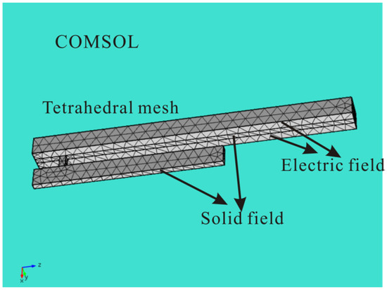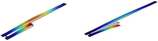 To verify the theoretical model and obtain the vibration mode of the coupled resonator, the software COMSOL was introduced to study the coupled resonant structure by using the multifield solver [49], as shown in Figure 2. Here, the coupling strength coefficient k can be obtained by using the software COMSOL. To get the two lowest frequencies of the system to be as close as possible, the stiffness of the coupling beam should not be too large. Meanwhile, to ensure the energy transfer between different resonators, the coupling beam stiffness should not be too small. When the length of the cantilever is near 60 µm, we obtain the coupling strength coefficient k = 507   N / m . Figure 3 shows the first mode and the second mode of the coupled structure. It was found that the first mode is in phase and the second mode is out of phase.