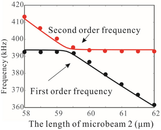 Figure 4. Variation of the first two natural frequencies versus the length of microbeam 2 when V d c = 2   V . The lines denote the theoretical results and the points denote the COMSOL results [49].