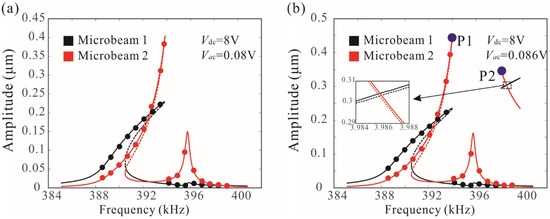 Figure 5. (a,b) Combined frequency response curves of the mechanically coupled microbeam resonators when L = 59.2   μ m . The lines denote the theoretical results, and the points denote the numerical results; P1 and P2 represent peak frequencies.