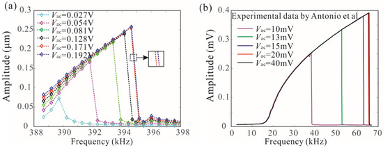 Figure 6. Frequency stability phenomena of mechanically coupled resonators. (a) Amplitude resonance curves of microbeam 1 with V d c = 8   V and different AC values; (b) experimental results of coupled resonant structure obtained by Antonio et al. [23].