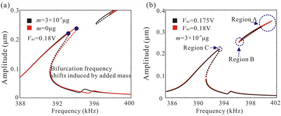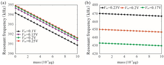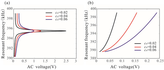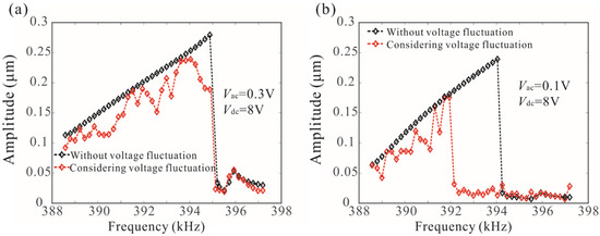 Figure 9. Effect of voltage fluctuation on dynamic behavior of a coupled resonance system. (a) The voltage fluctuation has no effect on the resonance frequency when V a c = 0.3   V ; (b) the voltage fluctuation reduces the resonance frequency when V a c = 0.1   V .