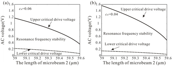 Figure 8. (a,b) Variation of the parameter space of frequency stabilization versus the length of microbeam 2 and AC voltage. Solid lines represent upper critical drive voltage; dotted lines represent lower critical drive voltage.