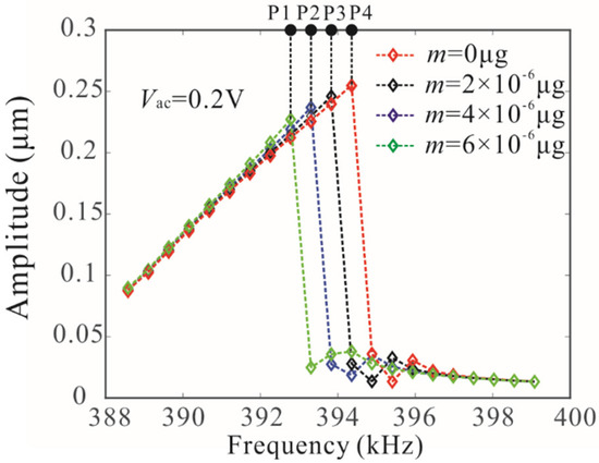 A MEMS resonant mass sensor mainly realizes detection by changing the resonant frequency and vibration amplitude of the structure caused by the adsorption of the elastic element of the sensor to the target analyzers [36,37,38,39]. Bouchaala et al. [40] derived analytical formulations to calculate the induced resonance frequency shifts caused by an added mass. The results indicated that the detection sensitivity increases with the decrease of size. However, with the reduction of size and complexity of the structure, there are obvious nonlinear effects and complex bifurcation behaviors [41]. Younis et al. [42] utilized the dynamic instabilities and bifurcations in a MEMS to realize novel methods and functionalities for mass detection. It was noted that bifurcation-based mass detection methods led to dramatically enhanced sensitivity and less performance deterioration due to measurement noise as compared to frequency shift-based methods [43]. Similarly, Nguyen et al. [44] used bifurcation jumping characteristics to propose a mass threshold detection method. Results showed that sudden jumps in amplitude can make the detection of a very small mass possible. Hasan et al. [45] studied the intelligent adjustable threshold pressure switch. When the pressure exceeds the critical threshold, the system can be induced to produce an amplitude jump, realizing the rapid sensing of pressure value. However, most of the bifurcation-based mass sensors are used in mass threshold detection. It is difficult to achieve high precision quantitative mass detection using this method.