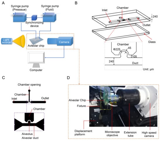 Model of the alveolus chip and experimental system. (A) Schematic diagram of experimental system. (B) Schematic diagram of the alveolar chip. (C) CAD drawing of the alveolar chip. (D) Photo of optical observation system. Figure (C) is adapted from the work of Lv et al. []. [Original citation]—Reproduced by permission of The Royal Society of Chemistry.