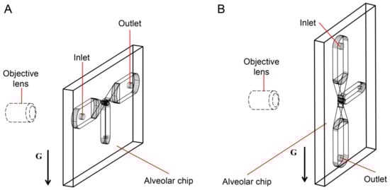 Assuming that the alveolar chip is placed horizontally on the microscope platform, the objective lens of the inverted microscope coincides with the gravity direction. Therefore, we can only observe the behaviors of particles on one horizontal plane in the image, and cannot study the influence of gravity on the particles. To solve this problem, the chip (the part enclosed by a yellow rectangle in Figure 1D) is placed parallel to the direction of gravity in this experiment. The objective lens is perpendicular to the plane of the chip and is connected to the high-speed camera through a long barrel. The high-speed camera is connected to a computer. As Figure 2A,B shows, the alveolar chip is placed in two directions to study the effect of gravity directions on the particle transport in the alveolus. In this way, we can compare the differences of particle behaviors when the direction of the gravity is parallel or perpendicular to ductal fluid flow.