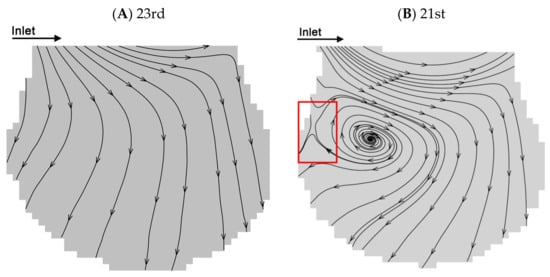 Two typical flow patterns which are reproduced from the work of Lv et al. [] are shown in Figure 3A,B. We use the same alveolar chip and flow parameters. According to previous studies [,,], there are two typical flows in the alveoli, i.e., radial flow and vortex flow. The fluid flow properties in alveoli at the 23rd and 21st generations with the two kinds of representative flow patterns are selected to study the particle transport behaviors. According to the streamlines, the fluid elements flow toward the direction perpendicular to the ductal direction in the radial flow pattern at the 23rd generation. The recirculation flow pattern at the 21st generation contains the radial flow and the vortex flow. The flow elements also flow toward the direction parallel to the ductal direction. Furthermore, the recirculation flow pattern contains a critical region (i.e., the part enclosed by a red rectangle in Figure 3B) with a saddle point.