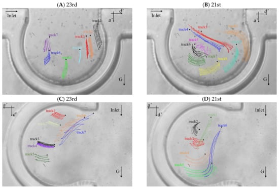 The particle trajectories of five respiratory cycles in the alveolus of the 23rd and 21st generations based on the two typical flow fields are shown in Figure 4A–D. We defined two directions for the particle motion, the one of which is perpendicular to the direction of the ductal flow (i.e., the direction of a’ axis in Figure 4) and the other one is parallel to that (i.e., the direction of d’ axis in Figure 4). The positive displacements are the positive directions of a’ axis and d’ axis. Lines with different colors represent the trajectories of different particles and are labeled track1, track2, track3, etc. The initial location of each trajectory is shown as a small black square. Figure 4A,B show the trajectories of particles in the alveolus of the 23rd and the 21st generations, respectively, when the direction of gravity is perpendicular to the direction of ductal flow. Figure 4C,D show the trajectories of particles in the alveolus at the 23rd and 21st generations, respectively, when the direction of gravity is parallel to the direction of the ductal flow. In this experiment, the Stokes number (Stk) of silver particles in the fluid flow is in the order of 10−6 which is much smaller than 1, indicating that the particles should follow the streamlines exactly. The results from the work of Tsuda et al. [] showed that the trajectories of massless particles show reversibility except for the trajectories in a “critical region” (in the red rectangle in Figure 3B) near the saddle point in the recirculation flow pattern. However, our results show that the trajectories throughout the alveolus show irreversibility. The particles not only move along the streamline (Figure 3), but also settle along the direction of gravity. The offset of the trajectory of the particle between different periods is caused by the gravity. The drag force is the main mechanics for particle motion in several periods, which is supported by comparing the length of the particle trajectories with offset of the trajectories, such as track3, track4, track7 and track8 in Figure 4B, track1, track2, track3, track4 and track5 in Figure 4C and track3, track4 and track5 in Figure 4D. The particles move further along the streamline than in the direction of gravity in a few periods. The particle trajectories at the 21st generation are longer than that at the 23rd generation, indicating that the velocity magnitude in the alveolus of 21st generation is relatively larger. Although the effect of gravity is relatively less than the effect of drag force, the gravity has a decisive contribution to the deposition of particles.