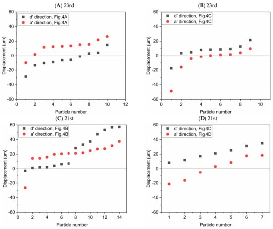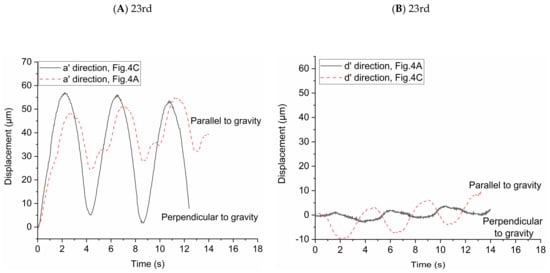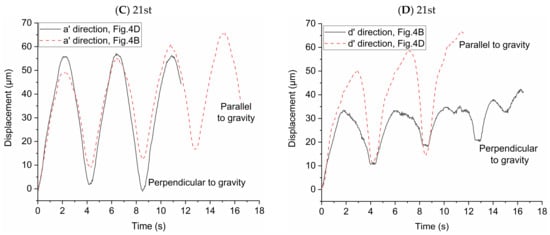 In order to study the influence of gravity on particle transport behaviors, the particle displacements relative to the initial location of each particle in two directions (i.e., the direction of a’ and d’ axes) were investigated. The high-speed camera was used to take pictures every 0.04 s and we used the Image-Pro Plus 6.0 (Media Cybernetics, Inc., Rockville, MD, USA) to get the locations of the particles in the two directions in each picture. We averaged the displacements of all the particles in the pictures to observe the overall trend of particle displacement in the two directions. In Figure 4A,B, the effect of gravity on the particle displacement is in the direction of a’ axis. In Figure 4C,D, the effect of gravity on the particle displacement is in the direction of d’ axis. The statistical average displacements of particles in the two directions are shown in Figure 5. Lines in the figures indicate the direction of particle displacement is perpendicular to the gravity and dashed lines indicate the direction of particle displacement is parallel to the gravity. When the direction of particle displacement is perpendicular to the gravity, the gravity has no effect (i.e., zero gravity) on the particle motion in this direction. However, the gravity has the most effect (i.e., normal gravity) on the particle motion in the direction that particle displacement is parallel to the gravity. Therefore, the particle motion under zero gravity and normal gravity can be quantified based on this method.