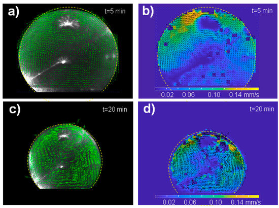 The PIV setup is shown schematically in Figure 1D. We used a Mitsubishi laser diode of with power and a . Other parameters can be found in (www.thorlabs.us/thorproduct.cfm?partnumber=ML101J27 (accessed on 23 May 2015)). The laser beam was defined by a aperture reducing the power to (). A significant contribution of the red laser beam to the convective flow is excluded in view of its wavelength in the water window and its low power. Complex convective flow patterns were, however, observed for a higher power laser () of focused to a spot and an increased absorption by using an oil droplet [12]. Image frames were recorded during evaporation by a DALSA DS-21-02M30 Charged-Coupled Device (CCD) camera with pixel resolution for binning, set at image frames/s. A relay lens system with a focusing objective provided a full view of the CCD camera on the droplet. The optics was set to obtain a resolution of 200 pixels/mm. A dedicated MATLAB script was written (G.M.) to communicate with the camera. The calibration was performed by recording a transparent ruler at the focal plane. A sequence of image frames was recorded up to an evaporation time of . MATLAB (R2017b, MathWorks) PIVlab, which is a particle image velocimetry (PIV) tool [20], was used to analyse the frames. The vector flow field obtained after PIV analysis based on a region of interest (ROI) of the image is shown in Figure 2a–d.