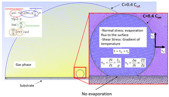 Boundary conditions for vapor diffusion are set as follows: no evaporation flux (Neumann Condition) through the support underneath, saturation vapor concentration was set at the interface between the droplet and the air, and the vapor concentration at room temperature (humidity = 40%) was set at the boundary of an external environment at a distance of about 40 mm (Dirichelet boundary conditions). For Navier-Stokes equation boundary conditions, two contributions are considered: evaporation flux to the surface giving a stress condition normal to the droplet interface and gradient of temperature giving a stress condition tangential to the droplet interface (Figure 3). Further details are provided in Section 2.3.2.