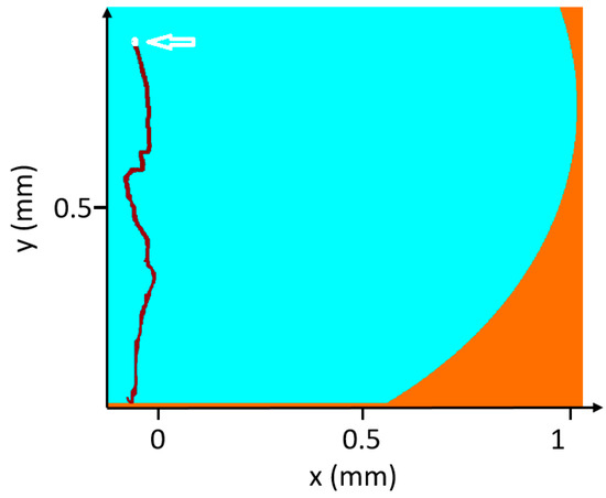 PIV measurements were conducted to track the path of polysterene particles (size of 36 μm) added to water solution during evaporation and to derive information on the trajectory. Figure 4 shows the trajectory of a single 36-μm particle superimposed in a white color. The starting position of the particle taken after 2 min. Therefore, the initial position is considered at about x0 = 0.05 mm, y0 = 0.89 mm, marked with a white arrow, and the final position at the bottom is reached after about 20 s. The trajectory of the particle was calculated from subsequent PIV images during the evaporation of the droplet using a method written in MATLAB (R2017b, MathWorks) by G.M., which includes the applications of image processing algorithms and a particle tracking method (for more details, contact G.M.). Particle tracking was limited to larger particles. However, as shown in the video of Supplementary Material, smaller particles continue circulating after 2 min. The recirculation goes on for a longer time until the volume of the drying droplet is further shrunk.