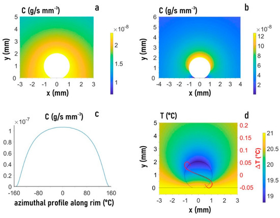 Finite element method (FEM) analysis of the evaporating droplet and its environment for and humidity. (a) Heat map of vapor concentration based on parula color map array (also b,d. (b) Heat map of the evaporation flux. (c) Evaporation flux along the rim of the droplet. (d) Heat map of temperature distribution. Overlay of temperature gradient curves at the rim () for central recirculating flow (solid red curve) and recirculating flows in two hemispheres (dotted yellow curve). Vertical axis: (), horizontal axis: (). The same as for the droplet.