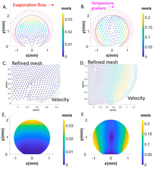 We explored the boundary conditions for the experimentally observed central recirculating convective flow (Figure 2a–d). FEM simulations reveal a dominating influence of the temperature gradient . Negative values along the rim shown by the red curve in Figure 5d result in a flow field and magnitude in flow velocity vectors (Figure 6A–F) agreeing rather well with Particle Image Velocimetry (PIV) results (Figure 2b,d). The shear stress generated by is about times higher than the evaporation-induced stress . The simulations reveal that smaller values modify the central recirculating flow field into recirculating flows in the two hemispheres of the droplet and reduce the magnitude of flow vectors (Figure 6A,C,E). The red temperature gradient in Figure 5d results about factor smaller flow vectors as compared to the central recirculating flow (Figure 6B,D,F) at the scale of previous simulations [16]. Thus, PIV reveals a central recirculating flow for evaporating droplets on a super-hydrophobic chip, differing from a pure Rayleigh convection observed for droplets on hydrophobic and wetting surfaces [14,15]. FEM simulations do not support a significant concentration gradient at the rim [14] as origin of the central recirculating flow but rather a thermal gradient requiring a higher shear stress than previously assumed [16].