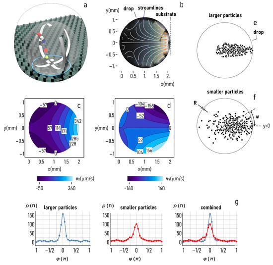 The substrate used in the study uses super-hydrophobic surfaces for maintaining solutions in a quasi-spherical shape (a). Because of its curvature and a temperature gradient, in the drop, develop convective flows with characteristic streamlines reported in (b) and values of velocity along the horizontal () (c) and vertical () (d) direction that vary between and a maximum of for the coordinate and of for the coordinate. The flow fields determined experimentally were used to estimate the transport of large (–(e)) and small (–(f)) particulates within the droplet. The particle density plot against the position in the drop reported for different particle sizes (g) illustrates that larger particles are mostly transported toward the center of the substrate.