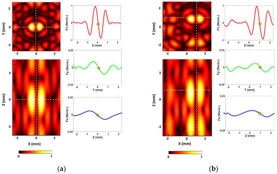 Based on the proposed UT array model, the acoustic radiation field can be simulated in COMSOL Multiphysics with a 1MHz frequency for 16 transducers. Figure 2 shows the normalized radiation fields and force values at the physical focal point of the array (0, 0, 0) and the manipulated point (1, 1, 1). In the simulation, the radiation force (nN) of each axis [, , ] are estimated as [2000, 280, 150] and [1600, 220, 100] at the physical focal point and manipulated point. In Figure 2b, the acoustic beam is manipulated into the (1, 1, 1) by using Equations (5) and (6). When the desired focal point is redefined as (1, 1, 1), each phase delay value is also calculated based on the modified number of cycles (N). These delay values make sure that the emitted waves from 16 transducers are re-overlapped at the new point. As shown in Figure 2b, the changed position of trapping nodes is presented, and these radiation force graphs show the typical feature of the twin trap that the vertical force () is the weakest force among each axis force.