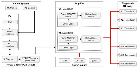 Figure 3 describes an overall block diagram of control hardware including a PC, FPGA module, vision system, a custom amplifier, power supply, and UT array. NI PCIe-7852R with FPGA module is hosted in the PC that is responsible for generating square wave with the voltage magnitude of 3.3 V, and two input signals are used to control bipolar voltage from the amplifier board. Namely, one signal controls the positive pole of the bipolar output voltage and the other one controls its negative pole. For amplifying the voltage from 3.3 V to ±30 V in continuous mode, the amplifier uses four MAX14808 boards in parallel connection. Each board amplifies four ±30 V output signals. The regulated DC 5 V and DC 3.3 V is supplied by P3030 power supply unit (Advantek, Hayward, CA, USA) with a maximum current of 3 A and an accuracy of ±0.1 V. The bipolar voltage from ±5 V to ±30 V is supplied by K633A power supply unit (Exso, Busan, Korea) with a maximum current of 3 A and an accuracy of ±0.1 V.