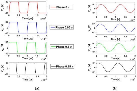 Figure 4 shows the driven signal for transducers with the phase modulation in radian at 0π, 0.05π, 0.1π, 0.15π, and the acoustic pressure in water is measured by hydrophone tip NH1000 (Precision Acoustics, Dorchester, UK).