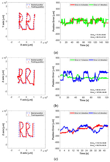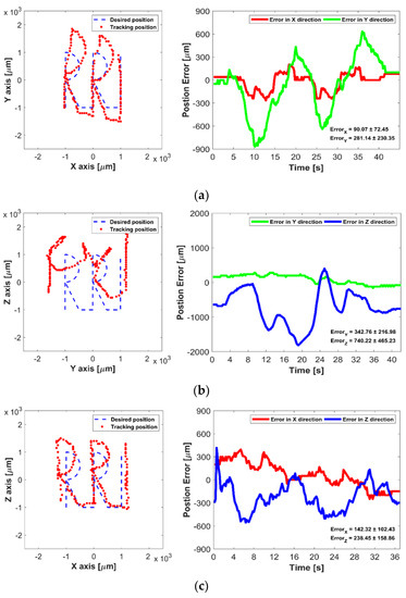 In the first experiments, the 2D manipulation ability of the proposed UT array was evaluated based on the open-loop methods. The micromotor was placed in the acrylic box filled with water, and it was then manipulated to move along the “RRI” text path in XY, YZ, and ZX plane, respectively. In open-loop control, the trapping point emitted from the UT array was automatically moved along the predefined text path with 0.1 mm incremental step. Figure 8 shows the desired and tracked paths of the micromotor controlled by the open-loop control, where the maximum average error is 740.22 465.23 in the YZ plane. The acoustic radiation forces along with Y- and Z-axis are less than that of the X-axis direction, as shown in the simulation results of Figure 2. Thus, manipulation ability in the YZ plane is unstable compared with other planes, furthermore, small position errors at each position in the path were accumulated, which caused the increase of the tracking position error in open-loop control.