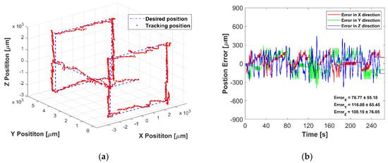 Experimental results of 3D manipulation: (a) The desired path and tracked position of the micromotor in 3D space, (b) Position error in X-, Y-, and Z-axis.