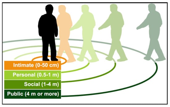 Social distances are present in our daily existence. The theory of proxemics is a concept used mainly to describe the human use of space. Edward T. Hall proposed the first definition, who pointed out proxemics as “the interrelated observations and theories of humans use of space as a specialised elaboration of culture” [24]. He presented how people perceive, interpret and use space, especially related to distance among people [25]. The theory of proxemics describes how people from different cultures not only speak diverse languages, but also inhabit different sensory worlds. In this respect, the distance has an indispensable role in proxemics in order to establish a region around the person that serves to maintain proper spacing among individuals.