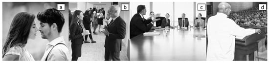 - Public zone, with distance greater than 4 m (greater than 12 feet). It describes the distribution of people in urban spaces, such as a concert hall or public meeting, where the people’s attention is focused on a moderator (Figure 2d) or in the street, in parks or museums, where the person is unaware of others. Other people’s identities are unknown among individuals that share the same space. This space sometimes varies depending on the situation. For example, at a concert or on public transportation, people are standing next to each other; in these exceptional cases, social, personal and even intimate zones are invaded. However, it is not considered an invasion as it is aware that the situation does not allow taking the corresponding distance. In other words, sometimes public distance becomes temporarily personal or even intimate space.