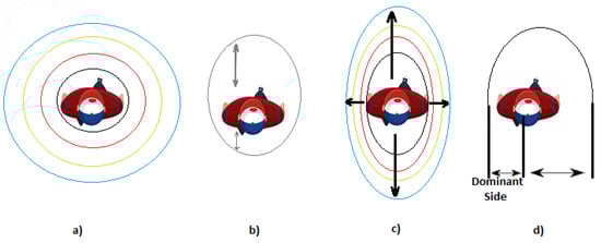 Although the proxemic zones of Hall are concentric circles, other studies have proposed different configurations that respond to difference aspects, such as culture, age, gender, personal relationship and context [22]. Figure 3 shows different configuration of proxemic zones [22]. Figure 3a shows the classical four proxemic zones of Hall’s theory, defined as concentric circles. According to the study presented in [32], people are more demanding with respect to their frontal space, considering frontal invasions more uncomfortable. Thus, egg-shaped proxemic areas, as shown in Figure 3b, are more appropriate. In public environments, the personal space refers to the “private sphere” in the Social Force model; thus, the movement carried by pedestrians is influenced by other pedestrians through repulsive forces [33]. Therefore, defining proxemic zones as concentric ellipses (see Figure 3c) seems to be more suitable. In [34], authors performed a study to state that personal space is asymmetrical, as shown in Figure 3d: it is smaller on the dominant side of the pedestrian (right-handed or left-handed). The study demonstrates that when people want to go through an insufficient space, they first evaluate the relationship between the size of the passage and the width of the body.