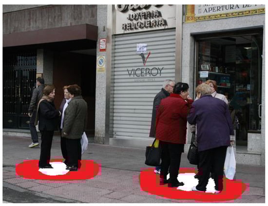 In crowed environments, people’s interactions are not only limited to person-to-person. Groups of persons also change the way an individual interacts with groups in which he/she is not participating (e.g., to do not pass through the group). Thus, it is also important to define proxemic zones for group of people. Results presented in [35] demonstrate that people fix more space around a group than with the sum of individual personal spaces. The concept of the “O” space, proposed in [36], allows detecting conversations. The “O” space is the area that delimits the main activity established by a group of people (e.g., having a conversation or focused in a common object or situation). Only participants can enter it, they protect it and others tend to respect it, and its geometric characteristics depend on the size of the body, posture, position and orientation of the participants during the activity. Orientation of people can help deciding which groups are conversing and how the space “O” is defined. The “O” space is extended with the “P” space in [36], which surrounds the space “O” to locate participants and their personal belongings. Figure 4 shows the “O” and “P” spaces in white and red circles, respectively.