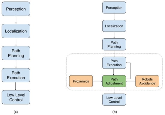 In scenarios where mobile robots interact with humans and other robots, their social behaviour must be adapted to robot–robot or human–robot interaction, accordingly. For robot–robot interaction, traditionally navigation algorithms for multi-robot systems are considered [12,29,30,31]. However, there is still a lack of attention on considering the integration of human–robot and robot–robot interactions, and adapting the robot’s behaviour accordingly.