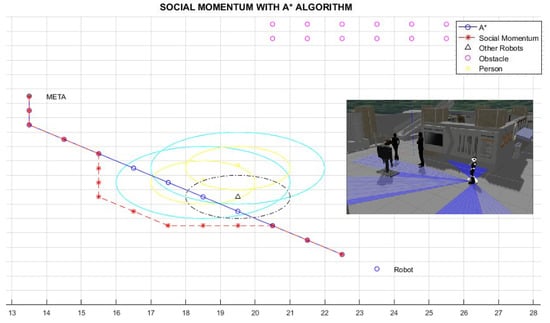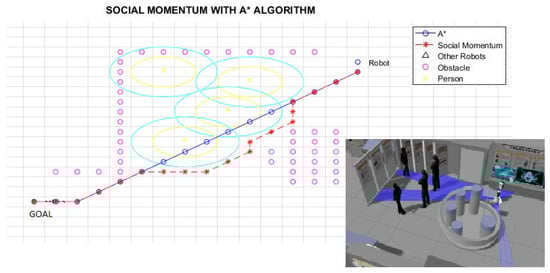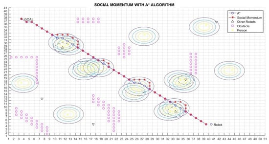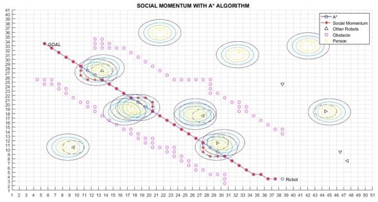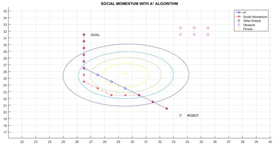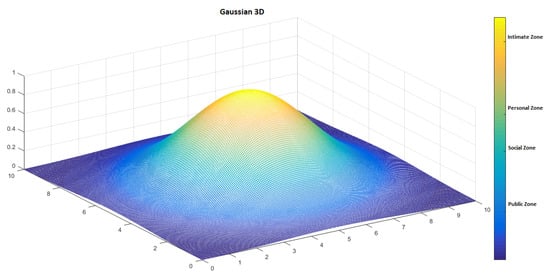 Social Momentum is a cost-based planner that detects an agent’s intentions about collision evasion protocols. This cost function is the weighted sum of the magnitudes of the angular moments, both of the planning agent (robot), and of the other entities in its environment (humans). This type of indirect communication of avoidance strategy results in easy-to-interpret movements, allowing the robot to avoid entanglements in its path. In an area overrun by many agents, whether people or robots, the planning agent interacts with each other, in the sense that each action that the robot takes transmits signs of intentions or preferences about evasion strategies (move right or left). Social momentum makes the robot read the movement preferences and associate them with its own. Social Momentum allows the robot to act pertinently and simplify everyone’s decision-making. In conclusion, Social Momentum is a frequent replanning algorithm in which in each planning cycle it determines an action [53]. If the robot identifies a future fault and decreases its velocity, its inactive time will be shorter, but if the robot does not cushion its path, it will be parked for a considerable time, which will cause a human discomfort in robot’s presence. The ideal is that the robot does not invade the intimate human space and keeps a constant and soft velocity, but not too slow to create a discomfort or get its task late. Social interaction spaces are widely modelled by using Gaussian functions [54].