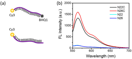 Both of the probes, N22 and N26, with a similar melting temperature (Tm) of about 71 °C, were labeled with a Cy3 fluorescence reporter and a BHQ1 quencher. Cy3, which emits greenish yellow fluorescence, is one of the most popular cyanine dyes and is commonly used to label nucleic acids. BHQ1 has strong absorption range of 480–580 nm, which provides excellent quenching to the Cy3 fluorophores. To verify that the separation of the quencher, BHQ1, from the fluorophore, Cy3, can generate enough fluorescence signal for detection, we designed another two control probes, N22C and N26C, without the label of BHQ1, for a comparison.
