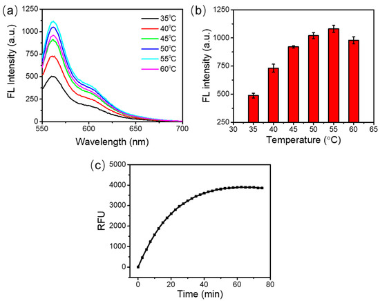As shown in Figure 2a, the fluorescence emission spectra had similar shapes at various incubation temperatures from 35 °C to 60 °C. The maximum fluorescence emission signal was obtained at 55 °C (Figure 2b). A higher or lower temperature yielded lower fluorescence emission signals. This can be attributed to the inefficient hybridization between the DNA probes and the target RNA at a high temperature, or the reduced activity of DSN enzyme at a low temperature. Therefore, 55 °C was selected as the optimal reaction temperature.