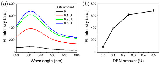 DSN enzyme activity. (a) Fluorescence emission spectra with various amounts of DSN enzyme. (b) The peak fluorescence values with different amounts of DSN enzyme.