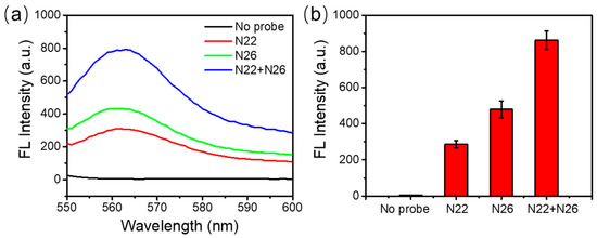 As showed in Figure 4a,b, either N22 or N26 alone can give a clear fluorescence signal when the target RNA is presented. N26 has a slightly stronger fluorescence signal than N22. This may be due to the length of the two probes. N26 had 26 nucleotides while N22 had 22 nucleotides in total. With similar melting temperatures, hybridization of N26 to target RNA could offer more sites for DSN to recognize and to cleave for signal amplification. The combination of both of the probes in the same assay clearly gave significantly stronger fluorescence, as expected. Therefore, it was quite feasible to improve the detection sensitivity and accuracy by using multiple specific DNA probes.
