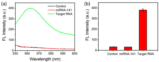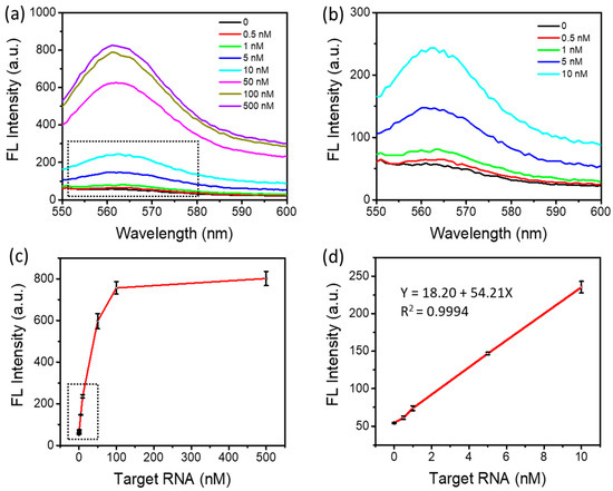 As shown in Figure 5a,b, a fluorescence intensity increase was observed when increasing the target RNA concentrations from 500 pM to 500 nM. The lowest detectable target RNA concentration was 500 pM. Figure 5c illustrates the changes in the peak fluorescence intensity depending on the target RNA concentrations. About 15-fold fluorescence enhancement was observed at the concentration of 100 nM above the background signal. As shown in Figure 5d, the fluorescence intensity was linearly dependent on the target RNA concentration in the range of 500 pM to 10 nM, with an R2 of 0.9994. The limit of detection can be down to approximately 500 pM, comparable to those of miRNA detection methods reported previously, as shown in Table 2. It is worth noting that such a relatively high sensitivity was achieved within 60 min in a one-step and simple detection method.