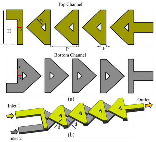 In our previous study [27], to inspect the mixing performance a micromixer including a two-layer (top layer and bottom layer) microchannel was proposed. The two inlet channels were joined with the main crossing channel at an angle of 90°, as shown in Figure 1a. The fluids were interrelated all the way through the vertical segments and at the center of every crossing segment. A consecutive structure of ten mixing units split and reconnected the fluid streams in a cyclic approach. The geometric dimensions of the projected micromixer were as follows: diagonal channel width (W), pitch length (PI), thickness of the main channel (H), depth of the single channel (d), vertical segment (b), and number of mixing units were 0.15 mm, 0.64 mm, 1.07 mm, 0.15 mm, 0.3 mm, 0.15 mm, and 10, respectively. The dimensions of the inlet channel were 0.15 × 0.3 mm, and the outlet channel was 0.3 × 0.3 mm.