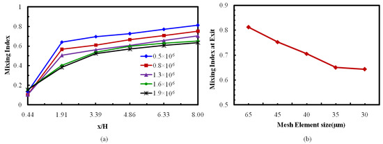 Grid dependency examination for reference design. (a) Mixing index with the channel length. (b) Mixing index at (x/H = 8.0) exit.