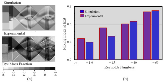The numerical model was validated qualitatively and quantitatively with experimental findings [27], as demonstrated in Figure 4. The induced uncertainties during the experimental process were wall unevenness and dimensional variation (±5 µm) in fabrication. The phenomena play a vital role in the variations of mixing performance (Figure 4b). The numerical scheme was validated quantitatively and qualitatively with experimental results, shown in Figure 4a. The visual photograph of the dye mass fraction distribution of fluid mixing was confirmed with the numerical result on the x–y plane situated at the center of the top and bottom channel depth (Figure 4a). The following graph (4b) represents mixing indices at Re = 1, 15, 40, and 60, which were quantitatively evaluates with experimental data [27]. Numerical prediction values of the mixing indices were marginally varied with experimental data throughout the Reynolds number range. The variation between the experimental and numerical results occurred due to the microchannel fabrication procedure, including dimension variations (±5 μm), wall roughness, and experimental uncertainties such as focusing and evaluating the experimental images. Nevertheless, the quantitative and qualitative evaluation between the experimental and numerical results demonstrates satisfactory agreement.