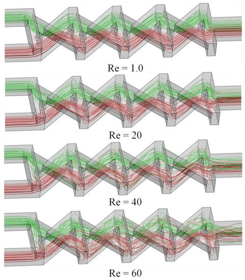 Streamlines originated from different inlets in the reference design micromixer for Re = 1.0, 20, 40, and 60.