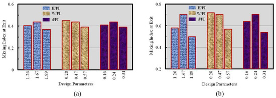Effect of the geometrical parameters on the values of mixing performance with three dimensionless parameters at (a) Re = 1.0 and (b) Re = 40.