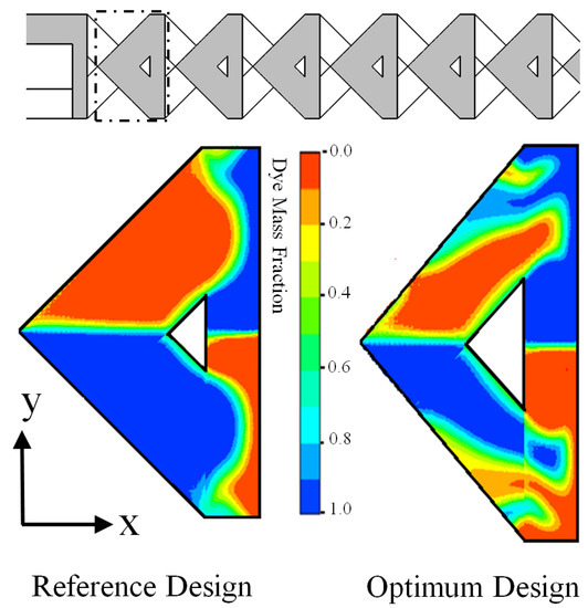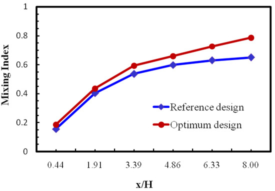 The developments of objective function (MI) value along the down way length of the micromixer for optimized geometry and reference design are represented at Reynolds number 40. Developing rates of the mixing index increase for both designs along the channel length, depicted in Figure 9. Figure 9 also represents the optimum design as having better mixing performance throughout the microchannel length, and the value of the mixing index-optimized design micromixer (x/H = 8.0) as having 1.4 times higher performance compared to the reference design.