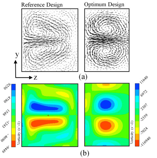 Figure 10a,b shows the velocity vectors plot and local vorticity variations on y–z planes of the reference and optimum designs, respectively. The cross-sectional plane was plotted (x/H = 8.0) at the end of the last mixing segment. A pair of counter-rotating vortices was observed in both cross-sectional planes. The optimized micromixer visualized a pair of small round-shaped (counter-rotating) vortices that filled the entire plane, while in the reference micromixer, two oval-shaped counter-rotating vortices shifted to the side wall; thus, velocity vectors became relatively weaker. On the other hand, the velocity vector for the optimum design micromixer indicated a strong transverse flow pattern, and velocity vectors were consistently spread all through the cross-sectional plane. The strongest transverse flow phenomena (Figure 10a) produced the difference in mixing performance for the optimized design micromixer. Figure 10b shows local vorticity distributions, plotted on the y–z plane for the reference and optimum design. The vorticity was designed by following formula:
