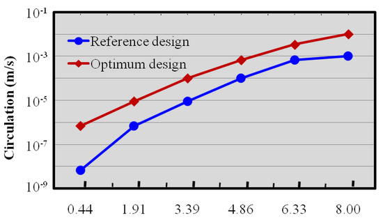 where, represents vorticity along the x-direction, and w and v are the velocity components along z and y directions. As the vorticity plot signifies, as compared to the reference design, the strength of the vorticity is augmented in the optimum design and creates the potential difference in mixing performance at the exit. Normalized circulation development along the reference design and optimum design micromixers is represented in Figure 11. Circulation values signify the potentiality of vertical movement on the plotted plane, as shown in Figure 10b. The circulation (Ωx) is articulated by incorporating the streamwise vorticity on y–z planes, mathematically represented as: